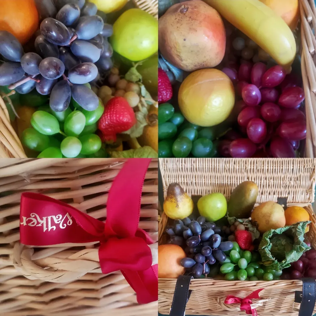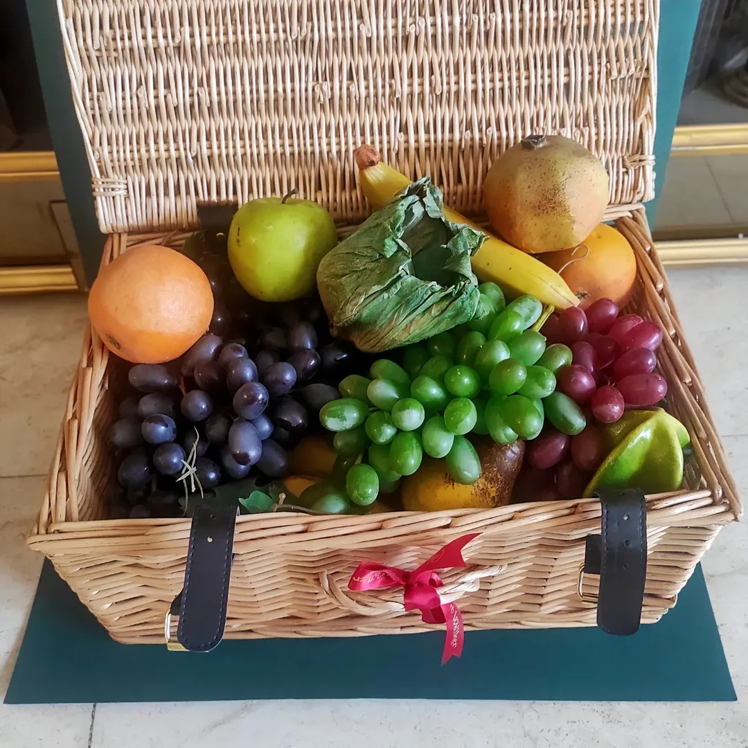 مناسب برای نگهداری انواع لوازم.ویکرهمپر انگلیسی با قفل چرمی و دستگیره / طول چهل عرض سی و ارتفاع بیست سانتیمتر / همراه با میوه های اروپایی مصنوعی