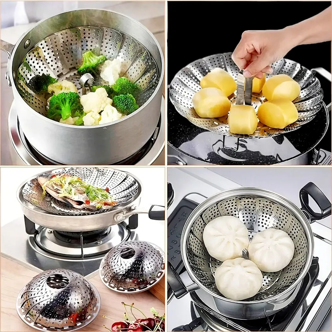 ظرف بخارپز پایه دار برای انواع خوراک ، میوه و سبزیجات. قابلیت تنظیم بین ۲۴سانتیمتر قطر.